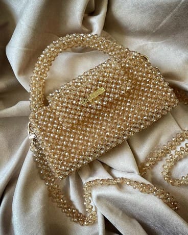 This handmade bag from Stich & Slumber showcases exquisite craftsmanship, adorned with delicate pearls and sparkling crystals. Its elegant design combines artisanal detail with refined materials, making it a sophisticated accessory for special occasions. The careful embellishments add a touch of luxury while maintaining a lightweight and comfortable carry. Ideal for those who appreciate expert handiwork and timeless style.